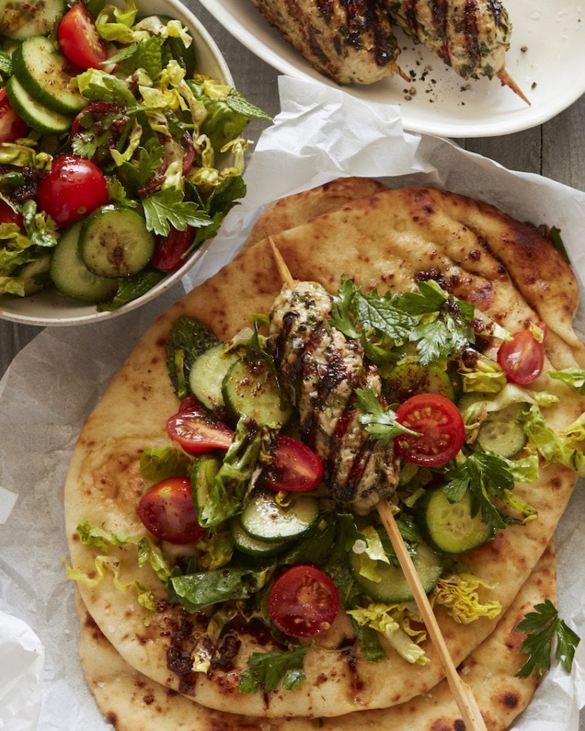 Chicken Skewers with Cilantro Mint Sauce - Chicken breast marinated in a greek yogurt mixture, then grilled until just slightly charred on the outside. Dunk it in the cilantro mint sauce and/or tzatziki! The more dips the better!