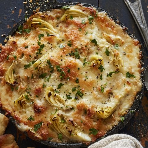 - Evenly spread the mixture in the skillet so itโs in a uniform layer and top with remaining Parmesan, Gruyรจre, Fontina and the panko. Bake until heated through, bubbling on the edges, and the cheese is melted, about 30 to 35 minutes. Let rest 5 minutes. Serve with Stonefire Naan for dunking.