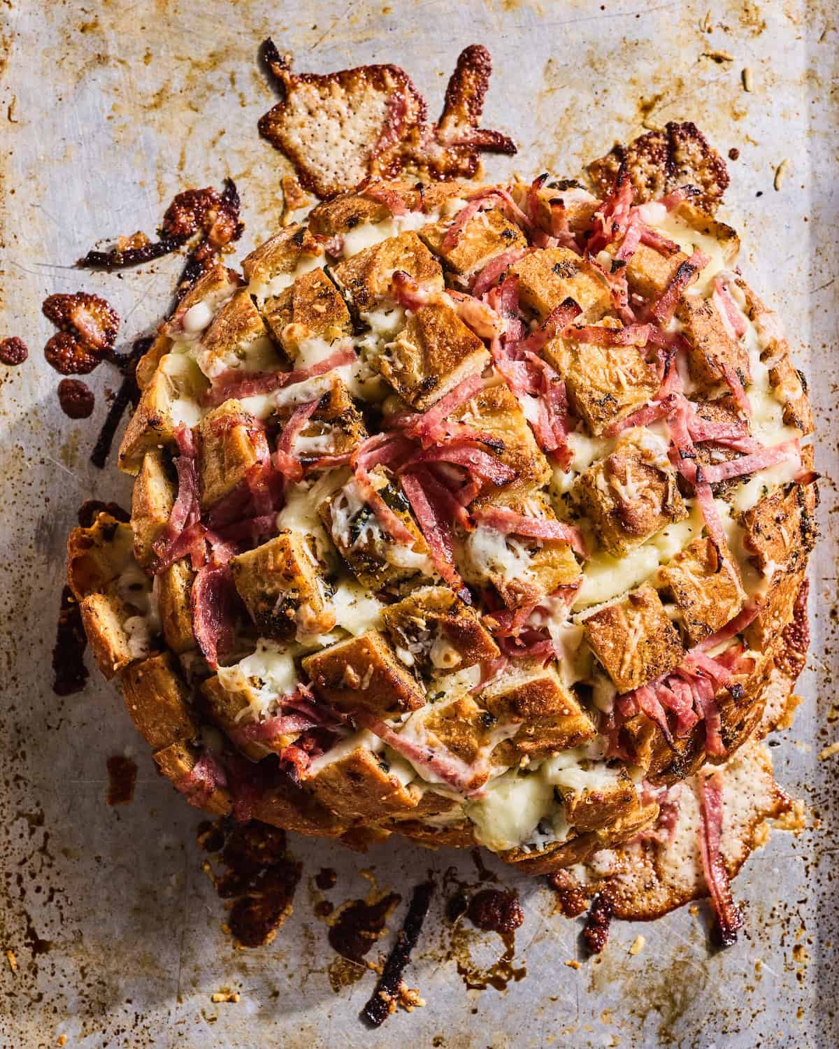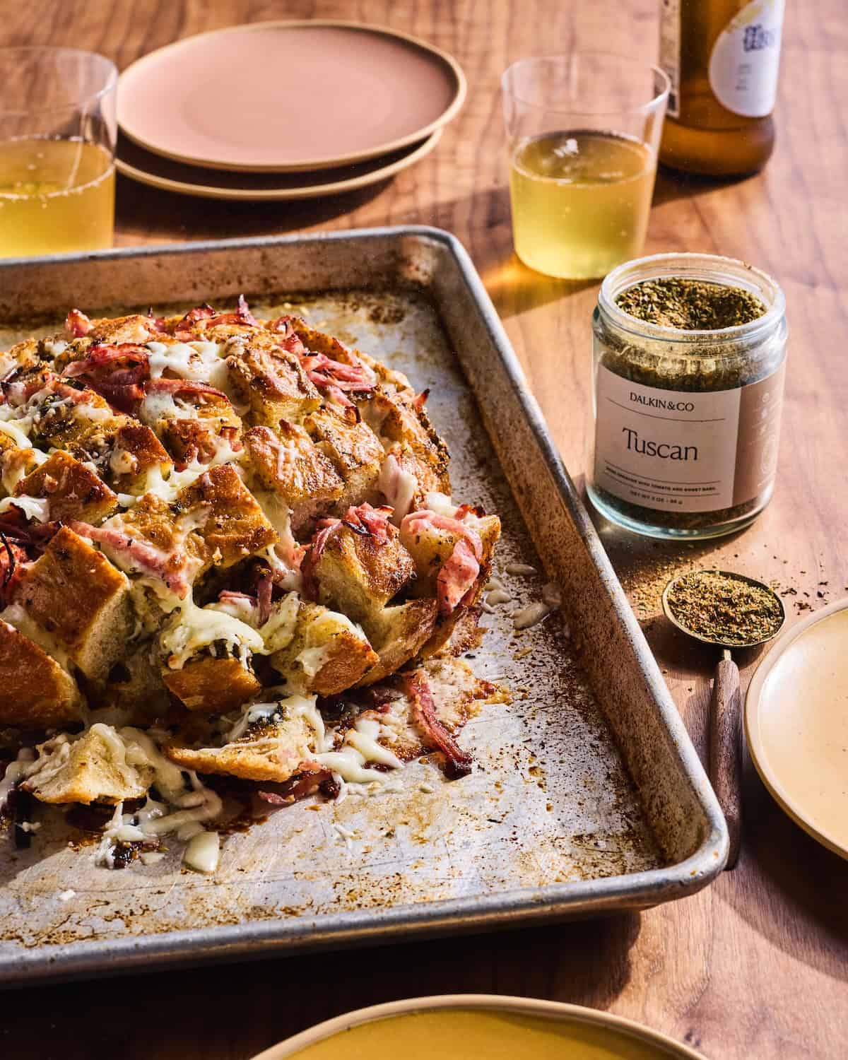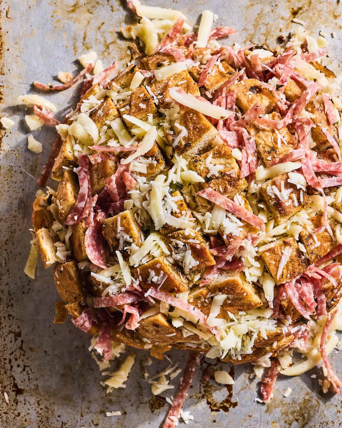 If youโre looking for the ultimate crowd-pleasing appetizer, this Cheesy Pull-Apart Bread is it. Itโs gooey, garlicky, herby, and packed with crispy bites of salami.
