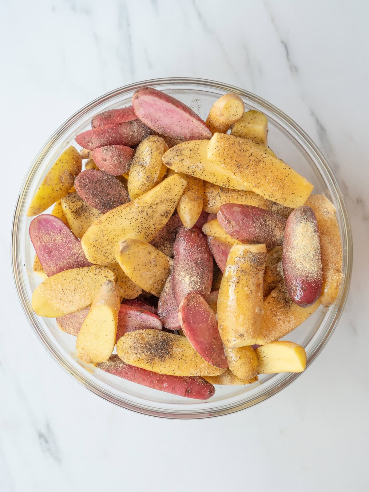 - In a large bowl, toss together the halved potatoes, olive oil, butter, garlic salt and freshly cracked black pepper.