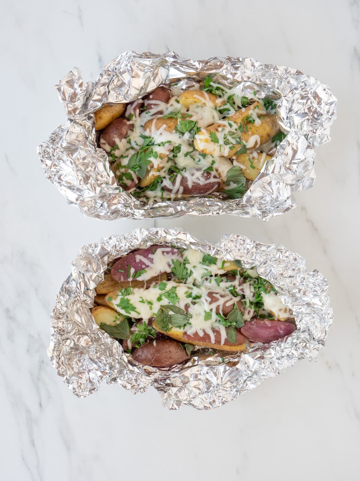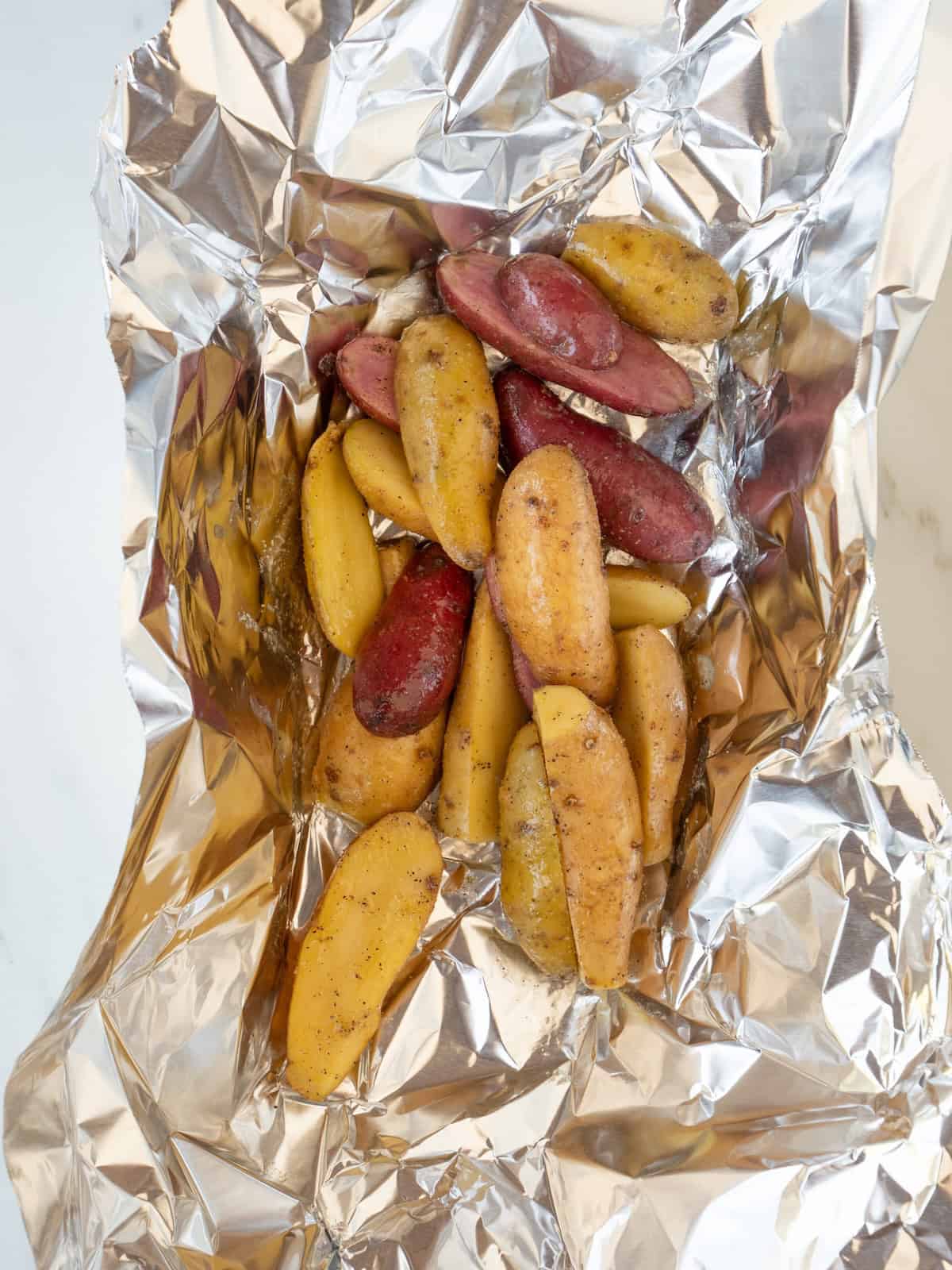 - Tear 4 large sheets of aluminum wrap, about 16 inches long each. Divide the potato mixture amongst the 4 sheets of aluminum foil and fold the sides up on both ends so you create a securely wrapped parcel for the potatoes.