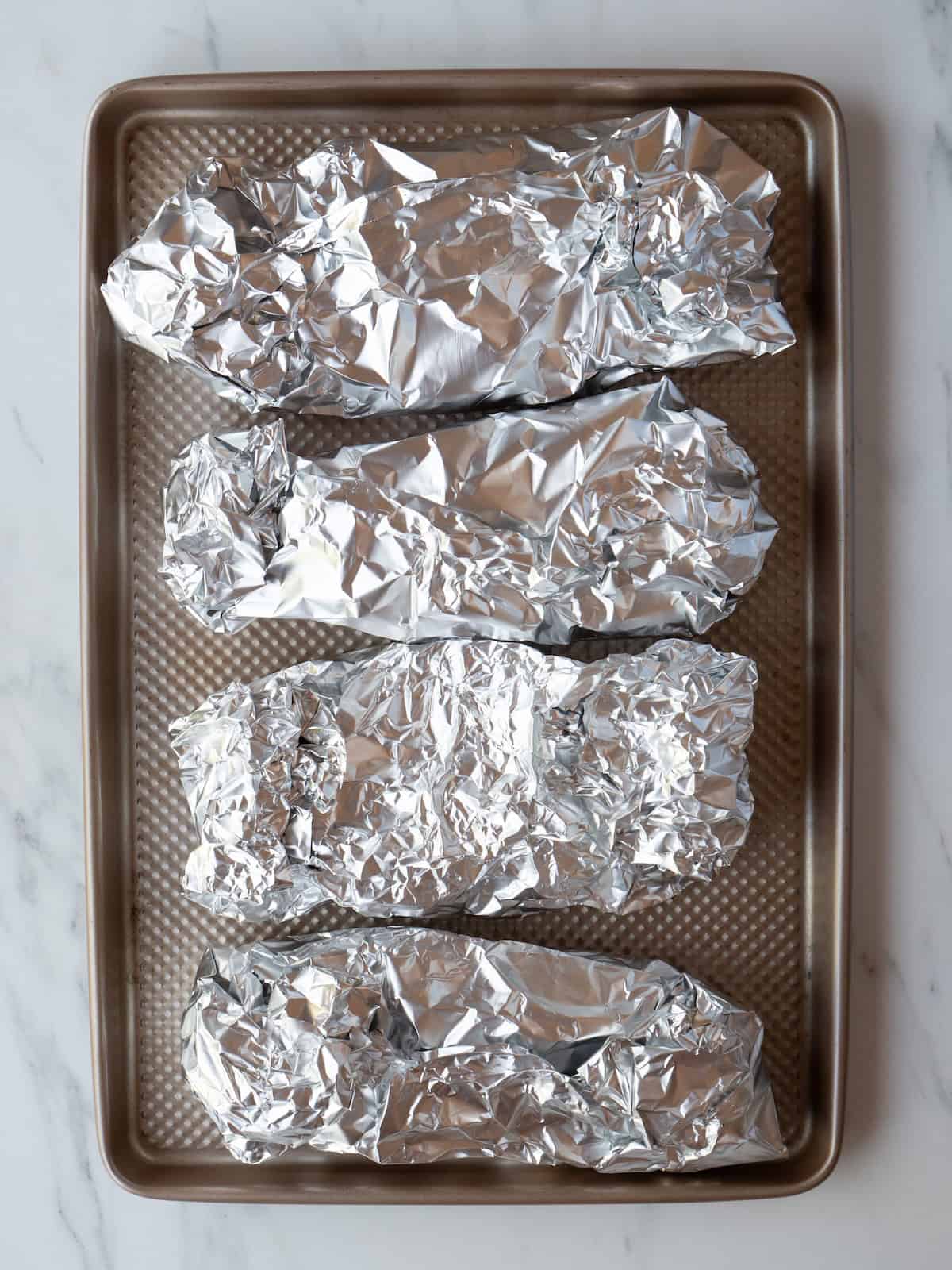- Place the 4 parcels on a baking sheet and transfer into the oven. Let the potatoes cook for about 25 minutes.