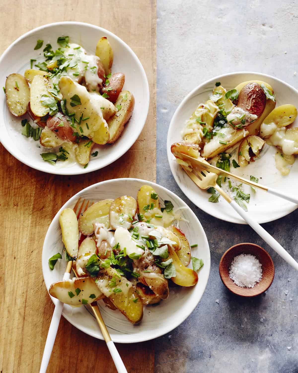 - Once cooked, open up each of the parcels and distribute the cheese on top of each portion of potatoes along with the torn herbs. Let the cheese melt before serving the potatoes and seasoning them with salt and pepper
