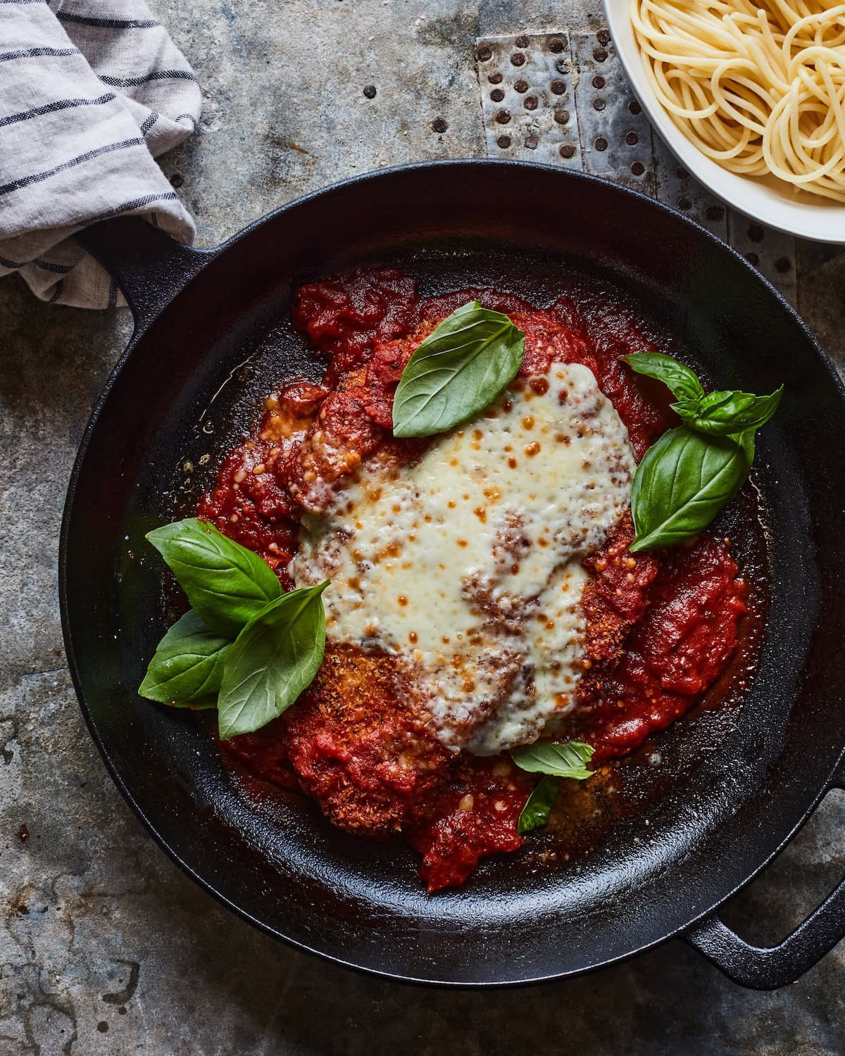 - Once the chicken is cooked, carefully wipe out the excess oil and brown bits from the cast iron skillet and add ยฝ of the pasta sauce in the bottom of a large skillet. If the skillet doesn't fit all the chicken breasts, use a large baking dish instead.