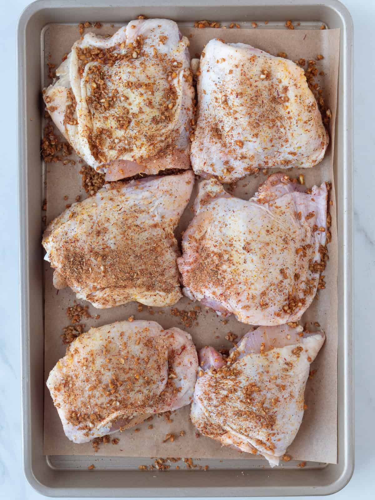 - 6-8 bone in skin on chicken thighs