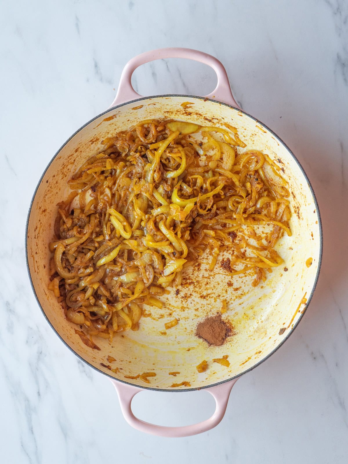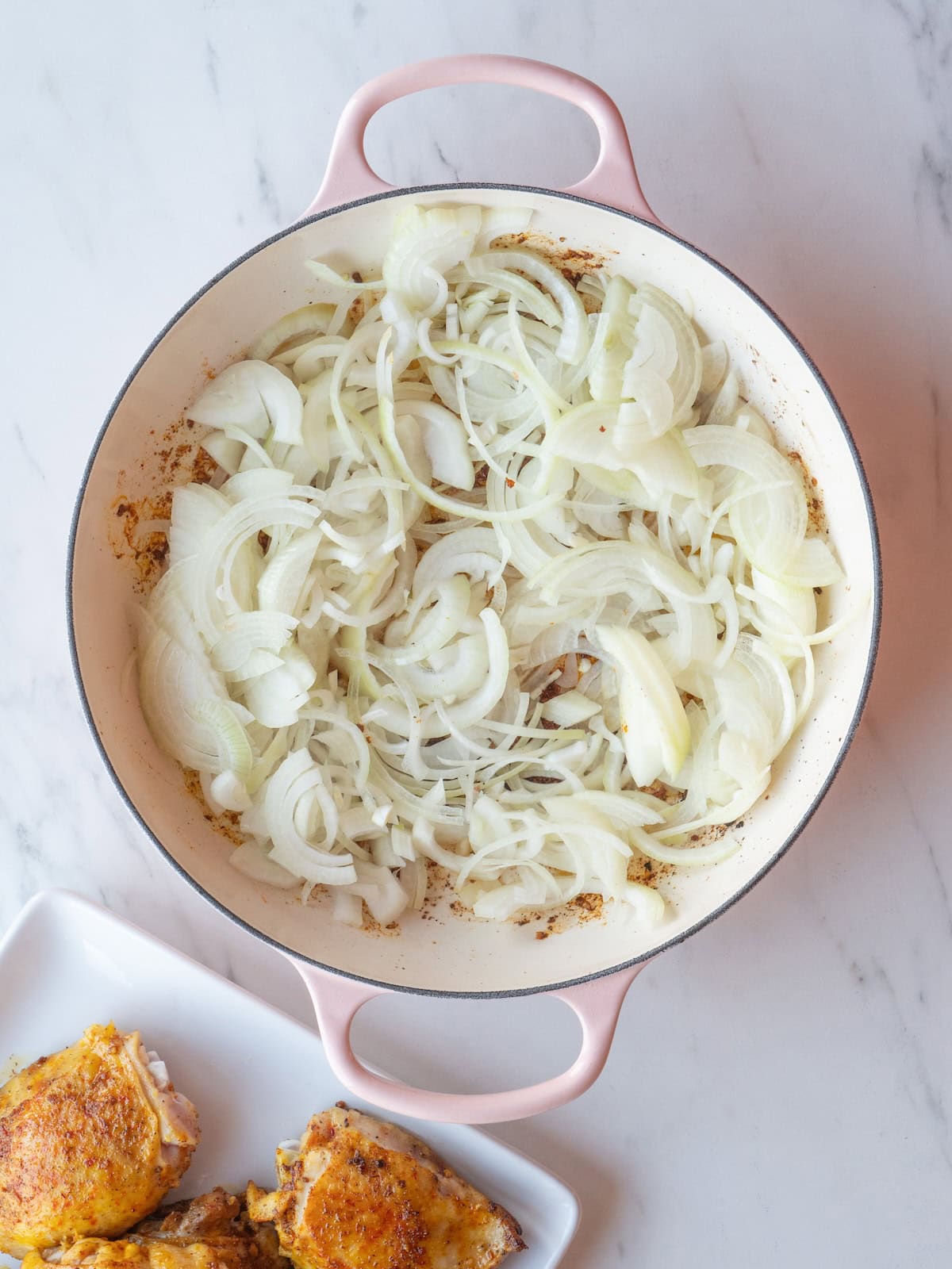 - Heat oil in heavy skillet. Add chicken, and brown on all sides. Remove to plate and set aside. Add onions to skillet, and cook over medium-low heat about 15 minutes, until they begin to caramelize. Add the ground cinnamon and stir to combine.
