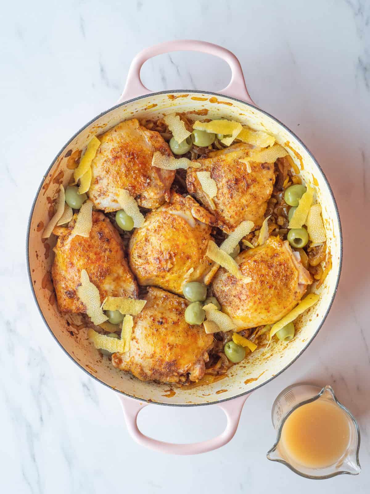 Step 6: Put chicken on onions. Scatter with olives and the lemon strips. Scatter over chicken. Mix stock and lemon juice. Pour over chicken.