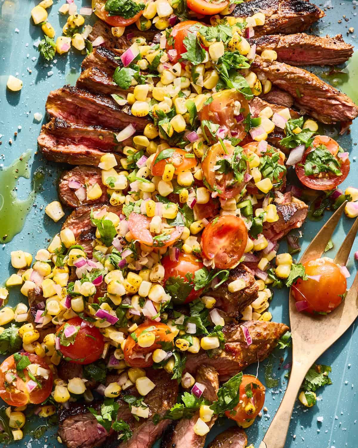 - Remove the steak from the marinade and let excess drip off. Grill for 4 minutes per side for medium-rare or 5 minutes per side for medium. Let rest for 5 to 10 minutes under foil. Slice thinly against the grain and top with corn salsa. Serve any extra salsa on the side.