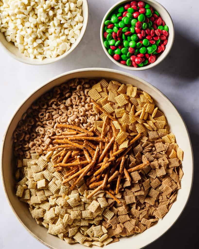 Cherrios, rice chex, wheat chex, pretzel sticks, M&Mโs and white chocolate.