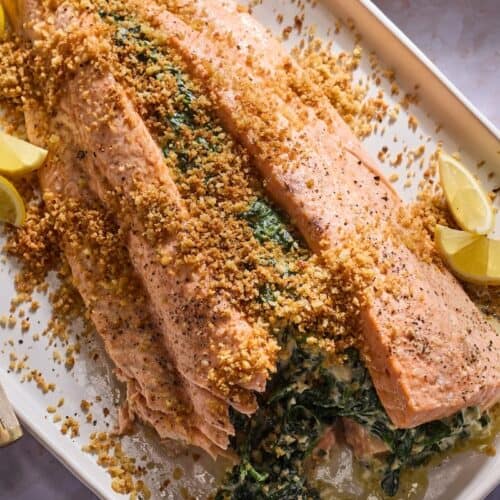 Creamed Spinach Stuffed Salmon is elegant, it is gorgeous on a platter, and it feeds a crowd without requiring you to spend your whole day in the kitchen. If salmon is your love language as much as it is mine, you need my Salmon Puttanesca, my Herb Crusted Roasted Salmon, and my 30 Best Salmon Recipes roundup bookmarked immediately.