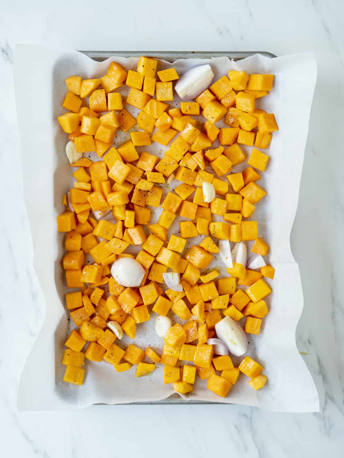 - On a large baking sheet lined with parchment paper, arrange the butternut squash, shallots, garlic and drizzle with olive oil and season with salt and pepper. Transfer into a 425-degree oven and roast for 25-30 minutes until the squash is fork tender.