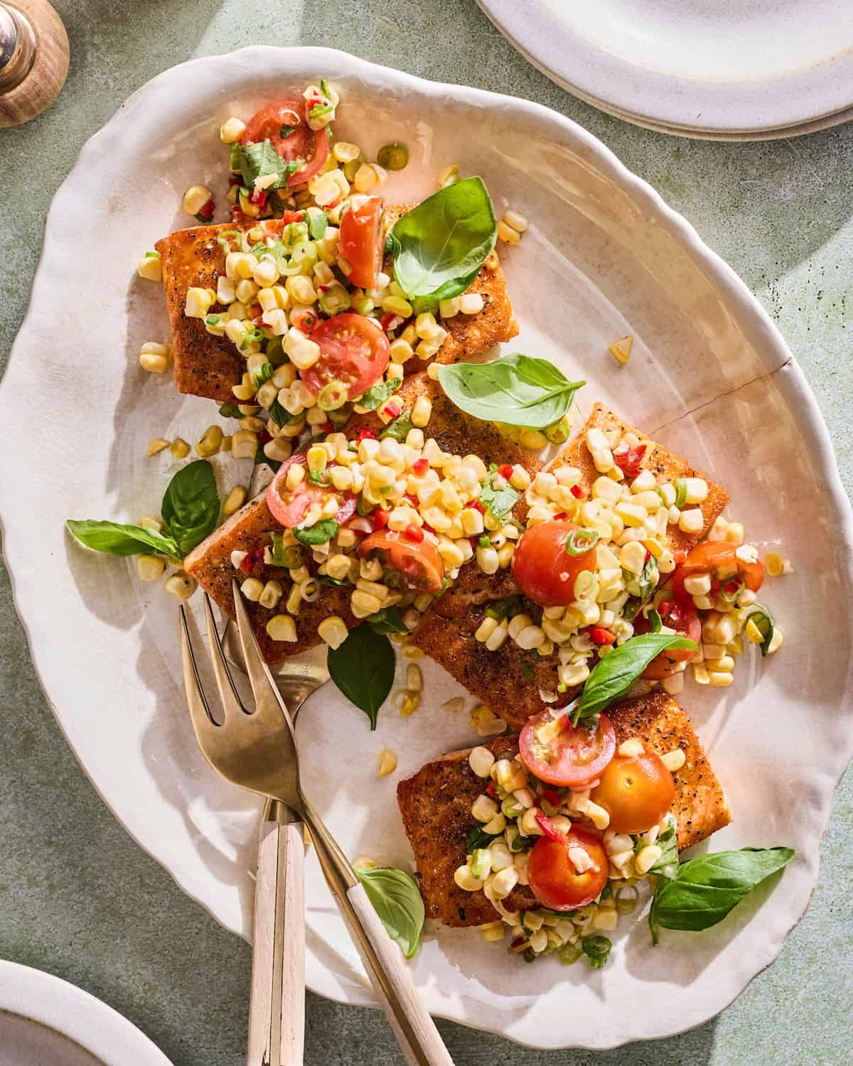 The flavor combo on Crispy Salmon Succotash is unmatched! Crispy salmon with a simple seasoning. Fresh pops of corn from the succotash. Herbs + a hint of acid from the vinegar. It's everything you want in a bite. And yes, you can eat raw corn!