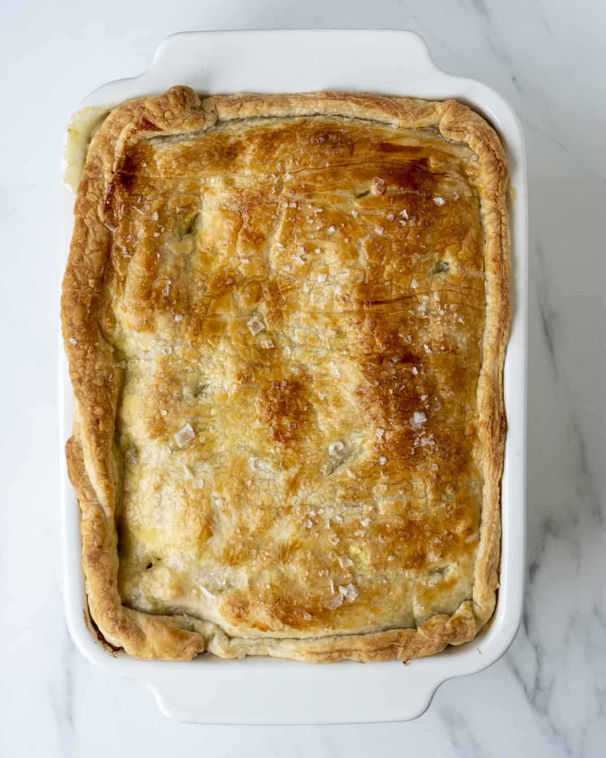 - Carefully lay the sheet of puff pastry on top of the baking dish and brush the surface of the pastry with the egg wash. Tuck any excess dough into the sides of the baking dish to create a crust and crimp the edges. Sprinkle some Maldon salt on top of the puff pastry / egg wash and then carefully cut a few small slits in the surface to allow any air to escape.