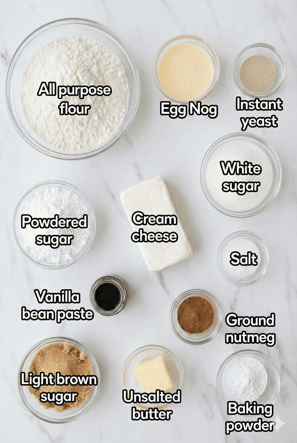 - ⭐ Why You’ll Love It: These rolls taste like pure holiday magic—fluffy, gooey, packed with cozy spices, and infused with real eggnog for the ultimate festive breakfast.