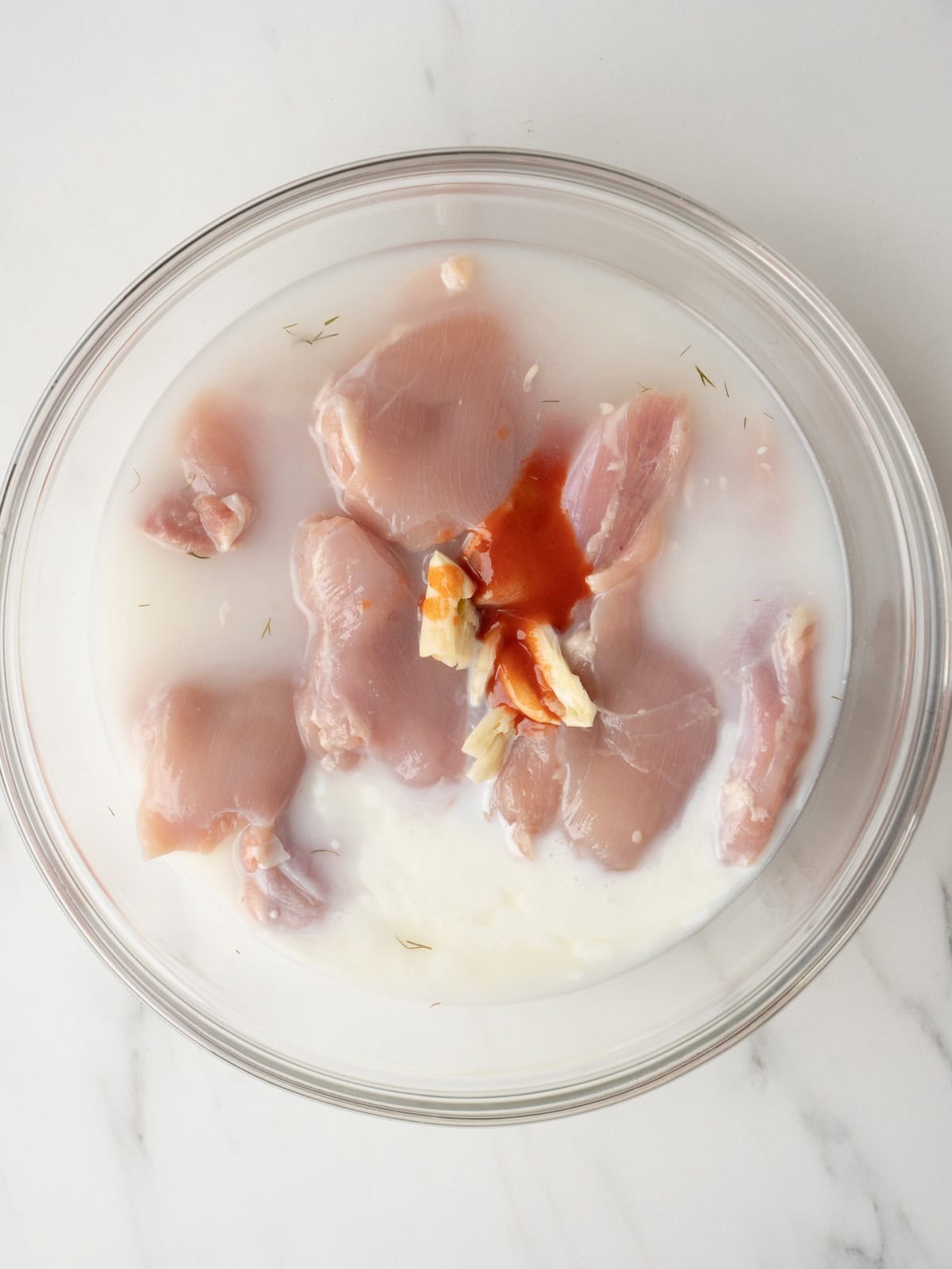 - In a large zip-top bag or bowl, combine buttermilk, pickle brine, hot sauce, and garlic. Add the chicken thighs, ensuring theyโre fully submerged. Squeeze out excess air and seal the bag (or cover the bowl). Refrigerate for at least 4 hours, ideally overnight.