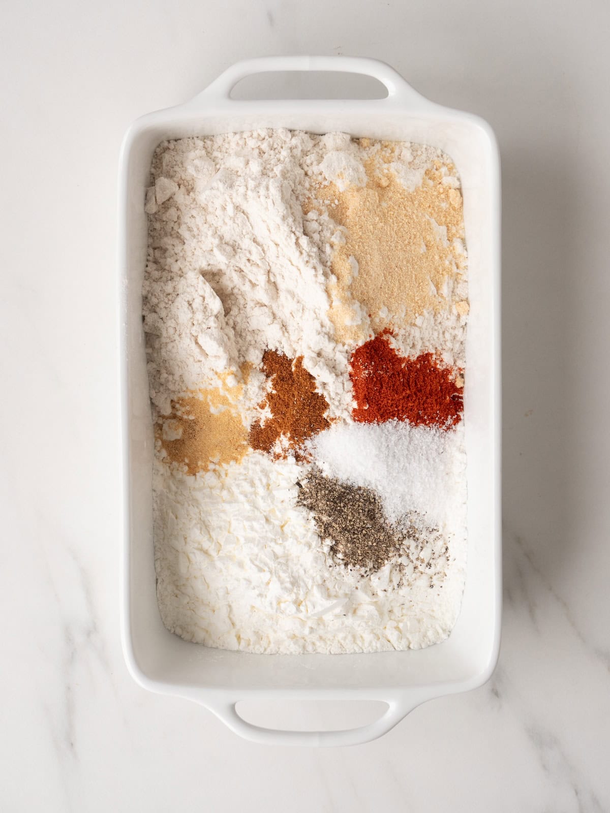 - In a shallow baking dish, whisk together flour, cornstarch, onion powder, paprika, salt, black pepper, cayenne, and garlic powder.