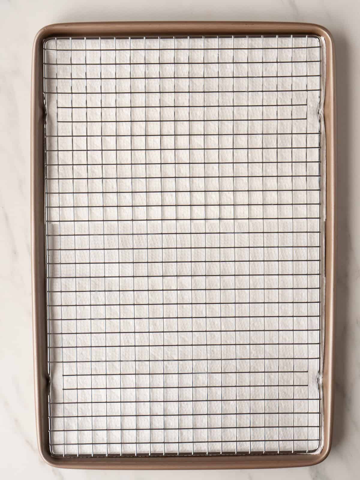 Step 3: Line a baking sheet with paper towels and a wire rack.
