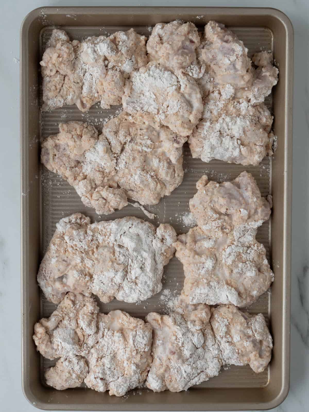 - Donโt press the flour mixture onto the chicken too hard; a light coating will crisp up better.