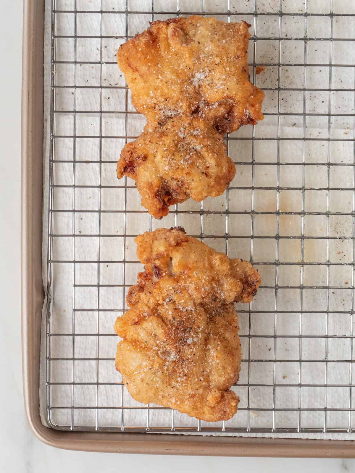 Step 6: Fry for 2 minutes per side, flipping as needed, until deep golden brown and internal temperature reaches 165ยฐF (about 8-10 minutes total). Transfer to the wire rack and season with salt and pepper. Repeat with remaining chicken. Keep warm in a 200ยฐF oven, if needed.
