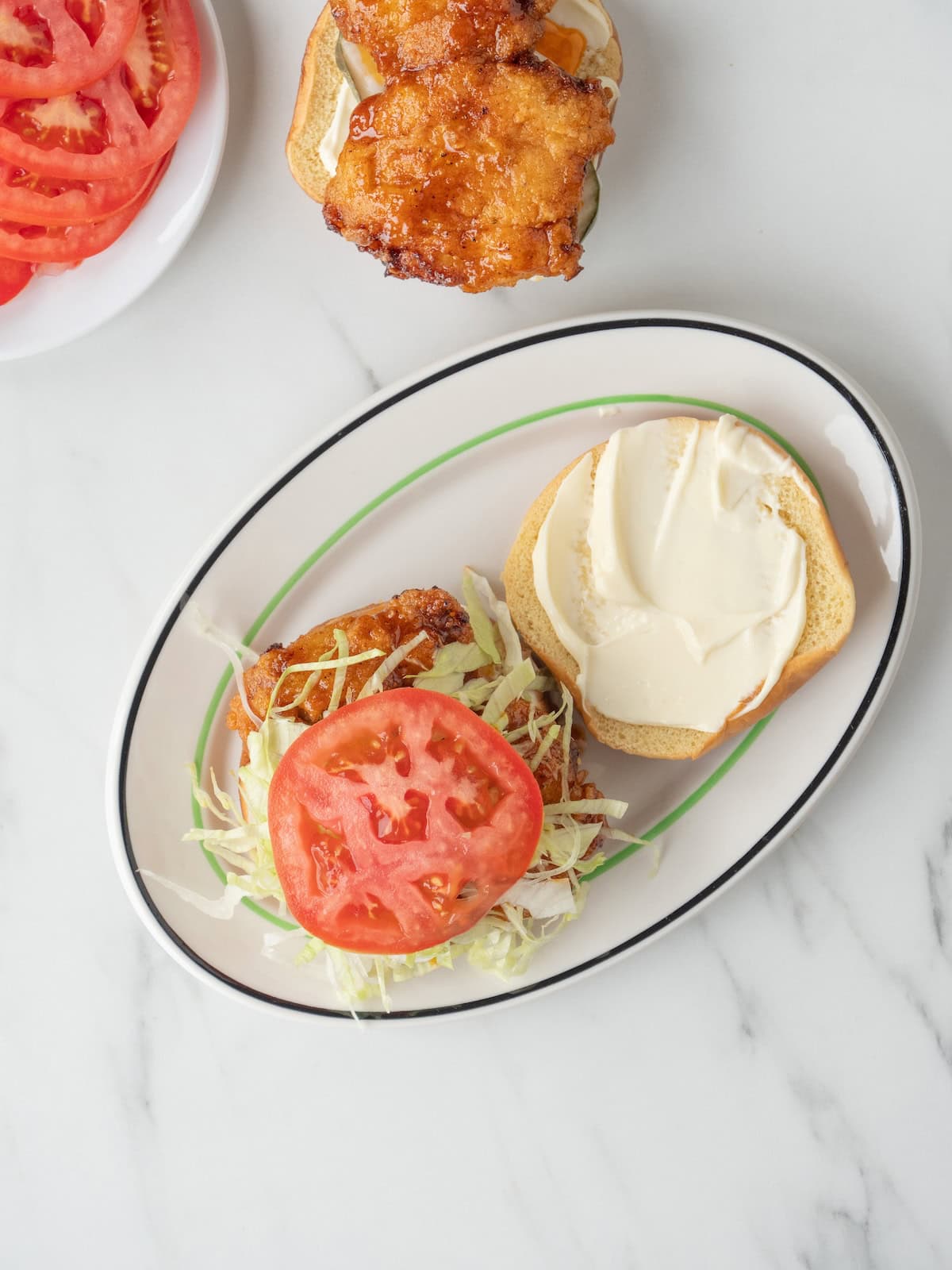 Step 8: Spread mayonnaise on both top and bottom buns. Layer with pickles, fried chicken, shredded lettuce, and tomato slices. Top with the remaining bun and enjoy!