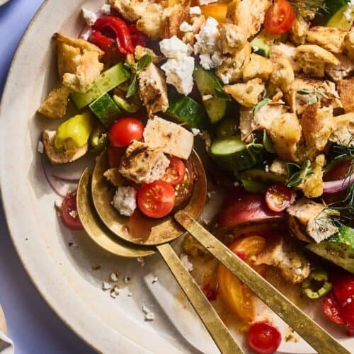 I LOVE LOVE LOVE this Greek Grilled Chicken Panzanella recipe because it has everything I want in a lunch or dinner or easy entertaining spread. Juicy grilled chicken thatโs been marinated in lemon, garlic, and herbs, crunchy homemade breadcrumbs that soak up all the vinaigrette, and a mix of fresh veggies that scream Greece! Itโs hearty but fresh, customizable with whatever you have on hand, and perfect for serving family-style. Honestly, Greek Grilled Chicken Panzanella is the kind of dish youโll want to eat outdoors with a chilled glass of rosรฉ while pretending youโre on vacation in the Mediterranean.