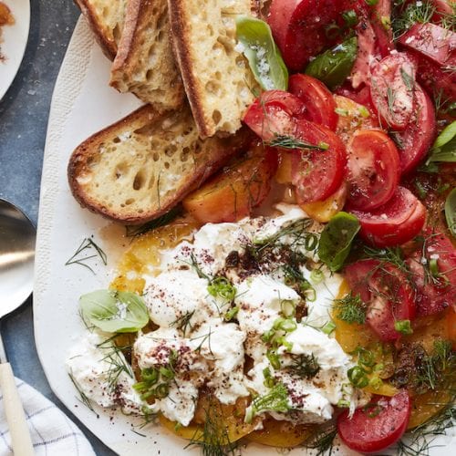 Arrange the sliced tomatoes on a platter. Tear the burrata into pieces and arrange on the tomatoes or tucked in. Scatter with the herbs. Drizzle with the vinaigrette as needed. Season with salt and pepper. You can also jazz things up even more with a Sumac dressing if that's more your jam!
