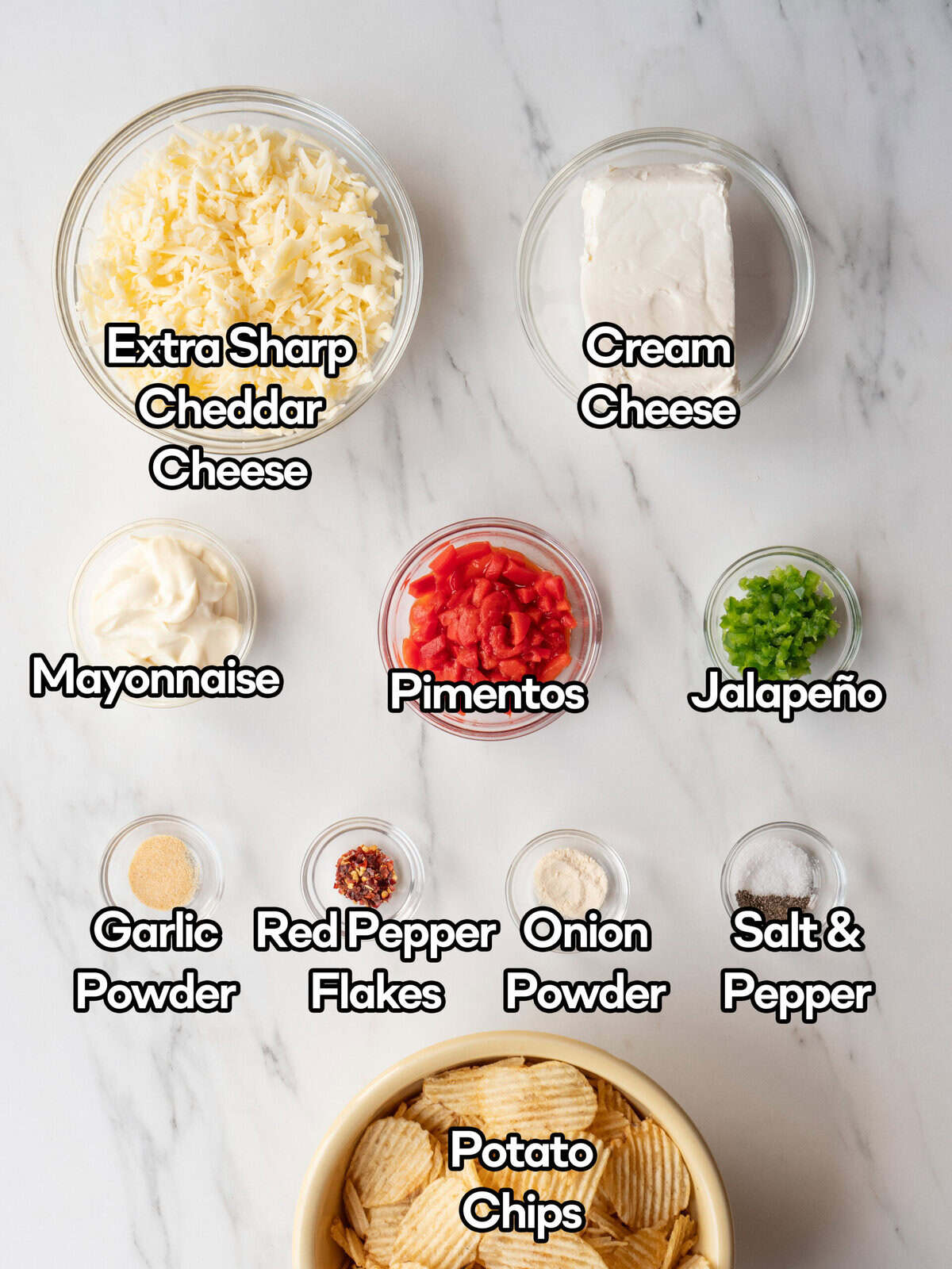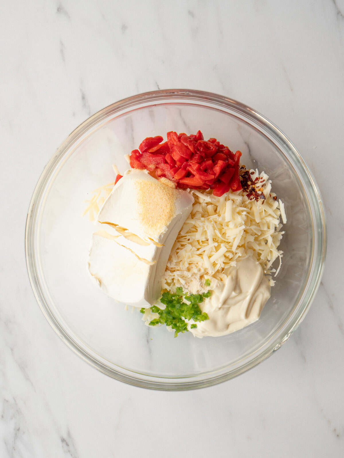 - In a large bowl, combine the shredded cheddar, softened cream cheese, mayonnaise, drained pimentos, minced jalapeño, granulated garlic, red pepper flakes, and onion powder. Mix until thoroughly combined and creamy.