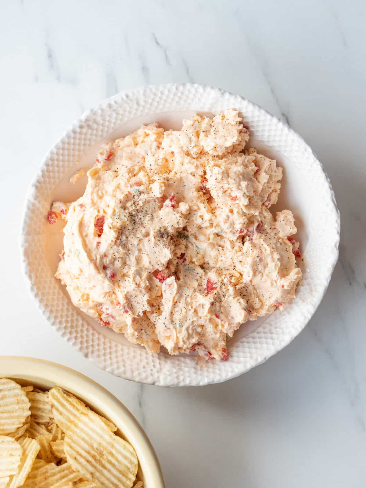 Potato chips are the classic and perfect pairing. Ritz crackers, celery sticks, sliced bell peppers, toasted baguette slices, and pita chips are all incredible options too. For a Southern-inspired spread, serve it alongside crackers and sliced pickles.