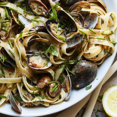 The Linguini with Clams recipe below calls for Manila or Littleneck clams. These are readily available at most markets and should be sold in a mesh / breathable bag as they are alive and still need to breathe. I try to buy clams the day of making this recipe or 1 day before. If it's a day before, store them in the fridge in a bowl. You can leave them in the mesh bag.