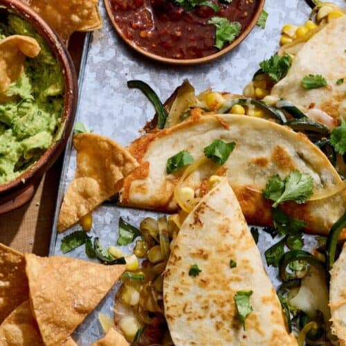 These poblano corn quesadillas are the kind of quick, flavor-packed meal that saves busy weeknights and lazy weekends alike. Crispy tortillas, melty cheese, smoky poblanos and sweet corn, it’s comfort food with a fresh California twist. Chunky Guacamole is not optional....it's mandatory! If you are throwing a party, these recipes pair great with these Quesadillas: Mexican Street Corn, Homemade Chicken Taquitos, Queso Fundido, and Esquites (Mexican Street Corn Salad).