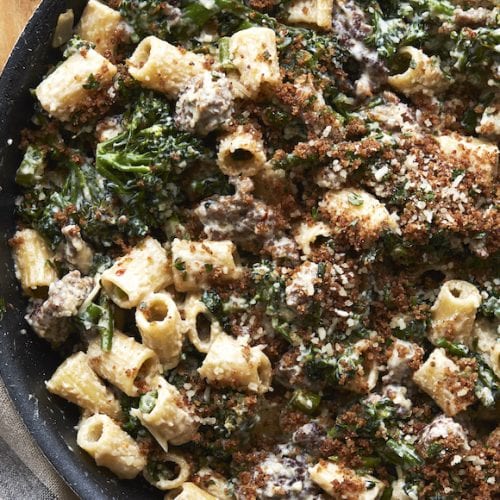- Add ยฝ cup of the reserved pasta cooking water to the skillet with the sausage and return skillet to the heat. Add the drained pasta, the whipped ricotta, and half of the Parmesan. Stir the ingredients in the pan to combine the ingredients, put back over medium heat, and cook for a couple of minutes to warm everything through and make a saucy consistency. Serve with more Parm and top with the breadcrumbs.