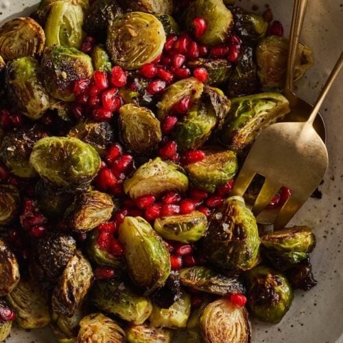 You can trim and halve the Brussels sprouts up to two days in advance and store them in an airtight container in the fridge. Roast them the morning of or even the day before, then rewarm in a hot oven for 5 to 7 minutes until the edges crisp back up. Whisk the vinaigrette in advance and keep it in a jar in the fridge. Toss everything together right before serving so the sprouts stay crispy and the pomegranate stays fresh.