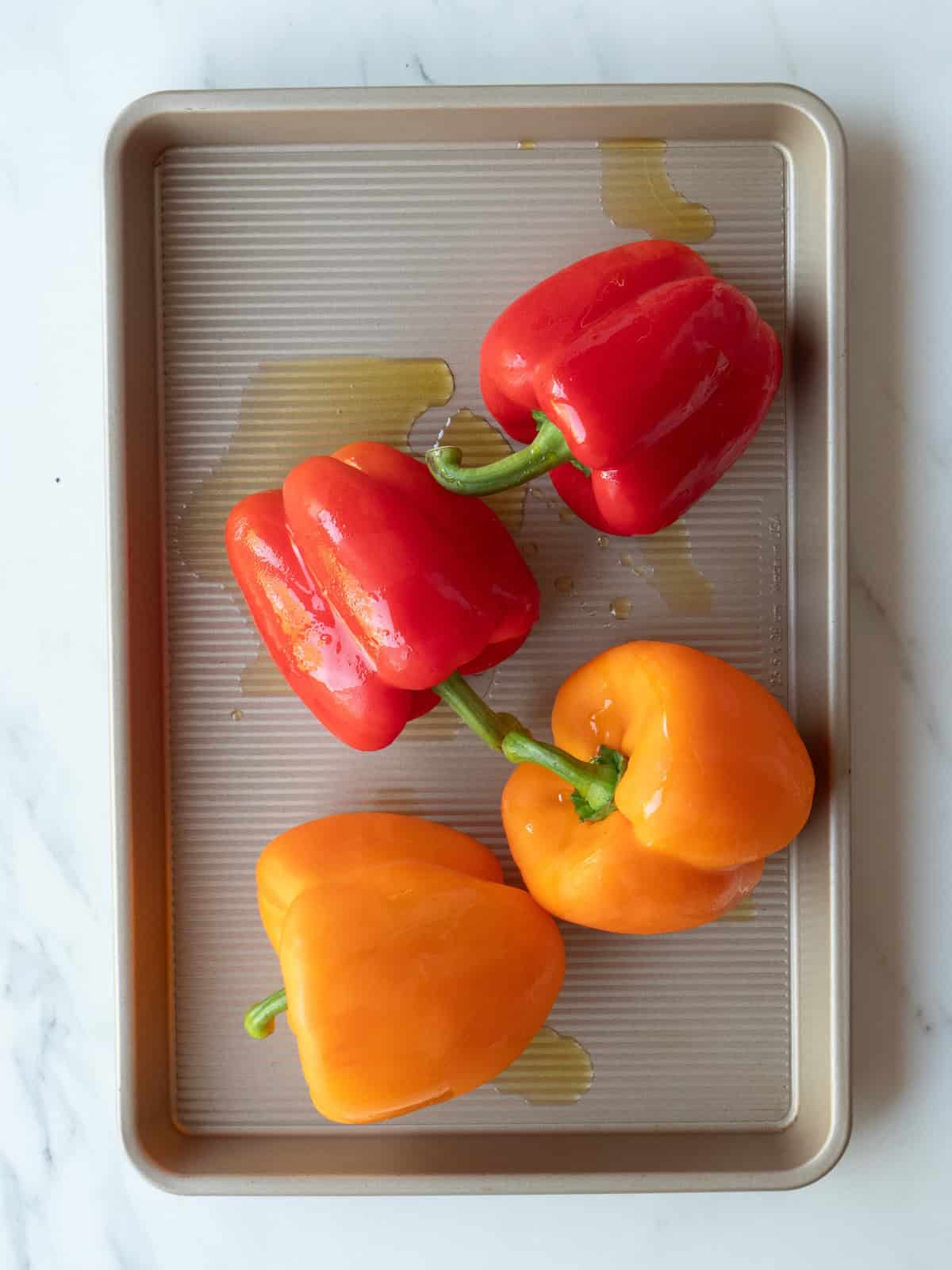 Step 1: Preheat broiler. Toss bell peppers and 2 tablespoons of oil on a rimmed baking sheet; season with salt and pepper. Broil, turning occasionally, until skins are blackened in spots and blistered all over, 10โ12 minutes.