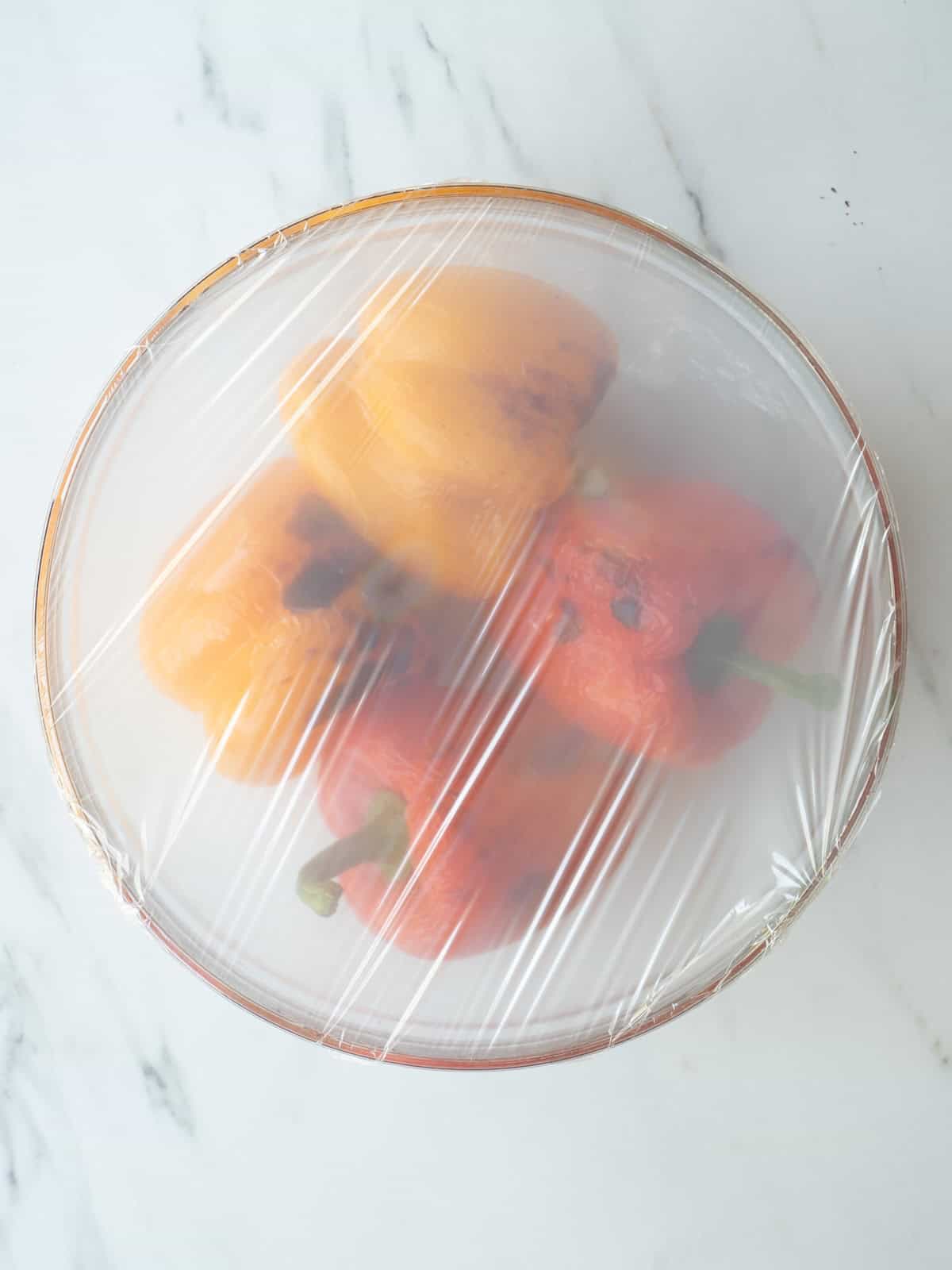 Step 2: Transfer peppers to a large bowl, cover with plastic wrap, and let sit 15 minutes. Reduce oven temperature to 400ยฐ F.