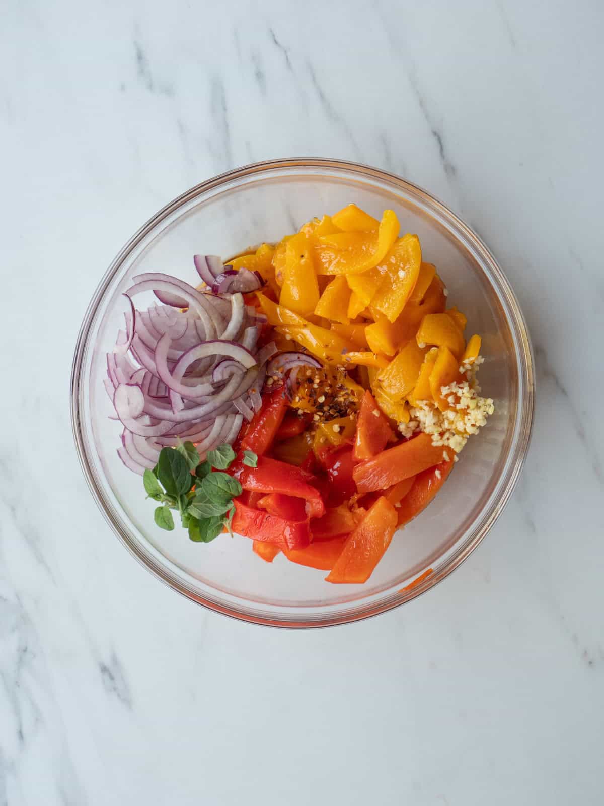 Step 3: Peel and seed peppers; cut into 2โ strips. Toss peppers in a clean large bowl with onion, garlic, vinegar, red pepper flakes, oregano, and 4 tablespoons of olive oil and set aside.