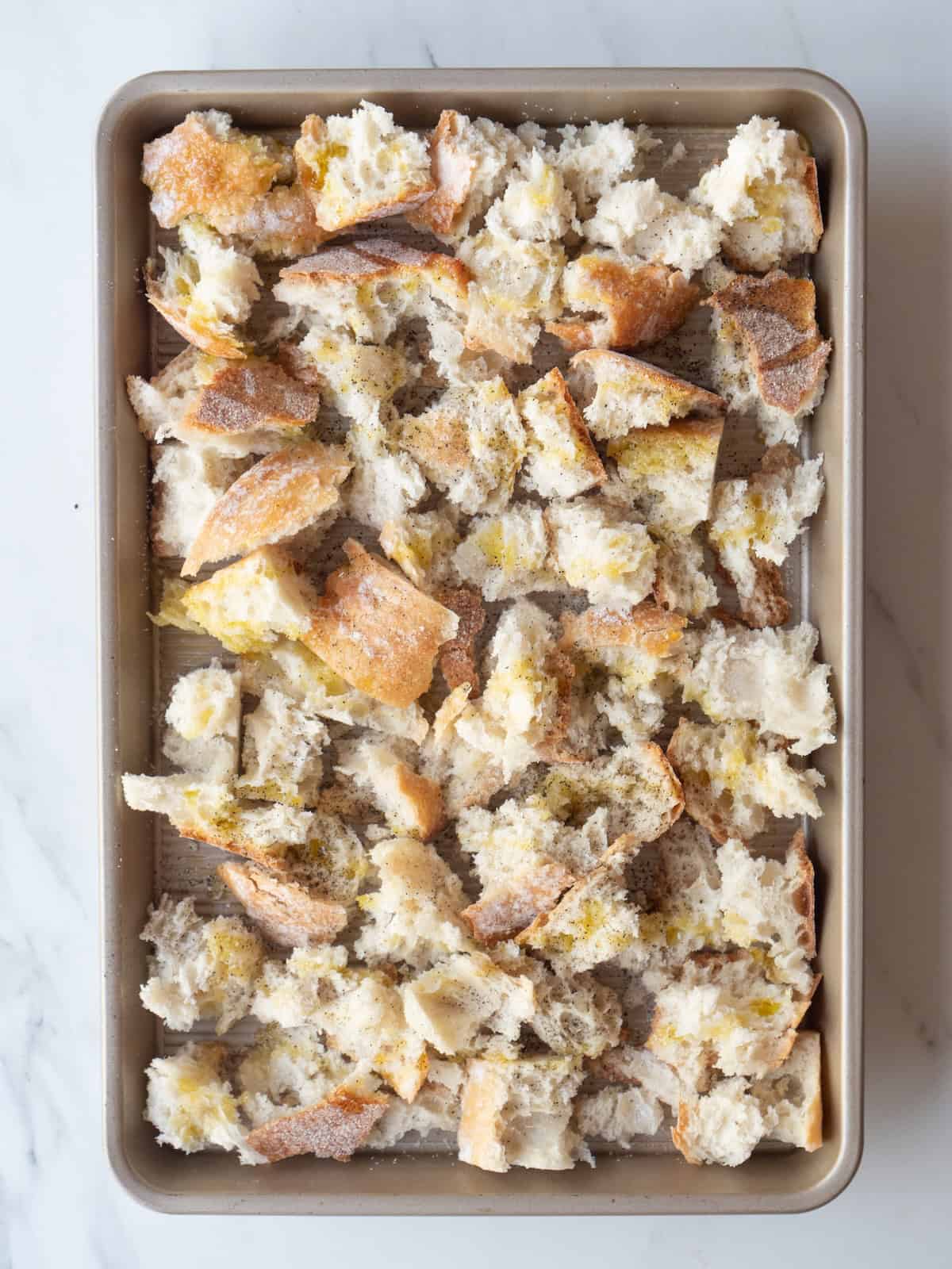 Step 4: Toss bread and remaining 2 tablespoons of olive oil on a clean baking sheet; season with salt and pepper. Bake, tossing occasionally, until crisp on the outside but still chewy in the center, 8โ10 minutes. Let croutons cool.