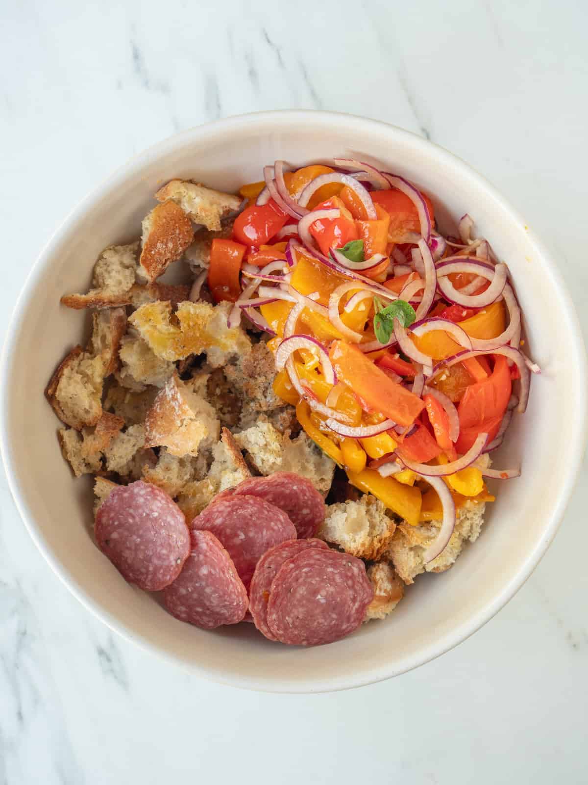 Step 5: Toss pepper mixture, salumi, and croutons in a large bowl.