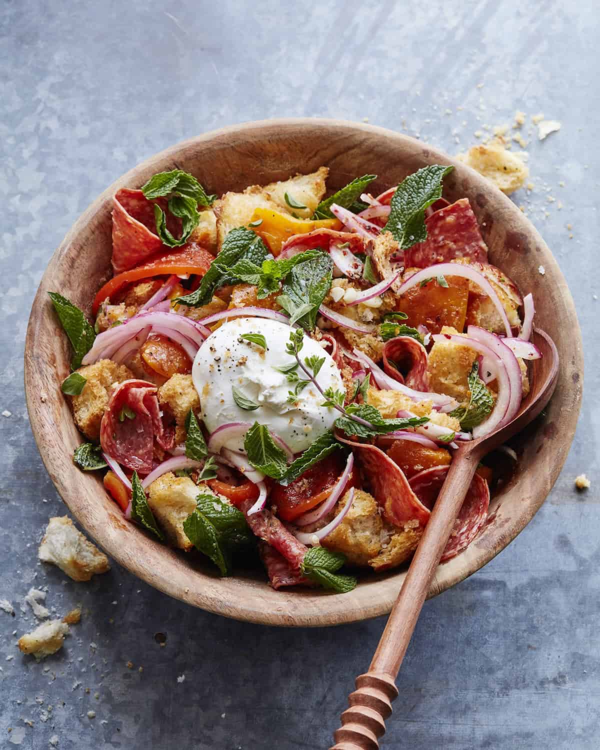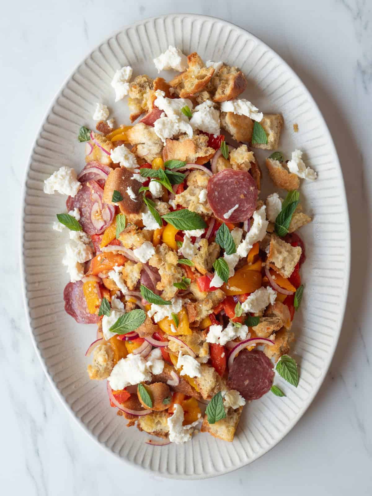 - Toss pepper mixture, salumi, and croutons in a large bowl. Arrange on a platter with cheese; top with remaining all the herbs.