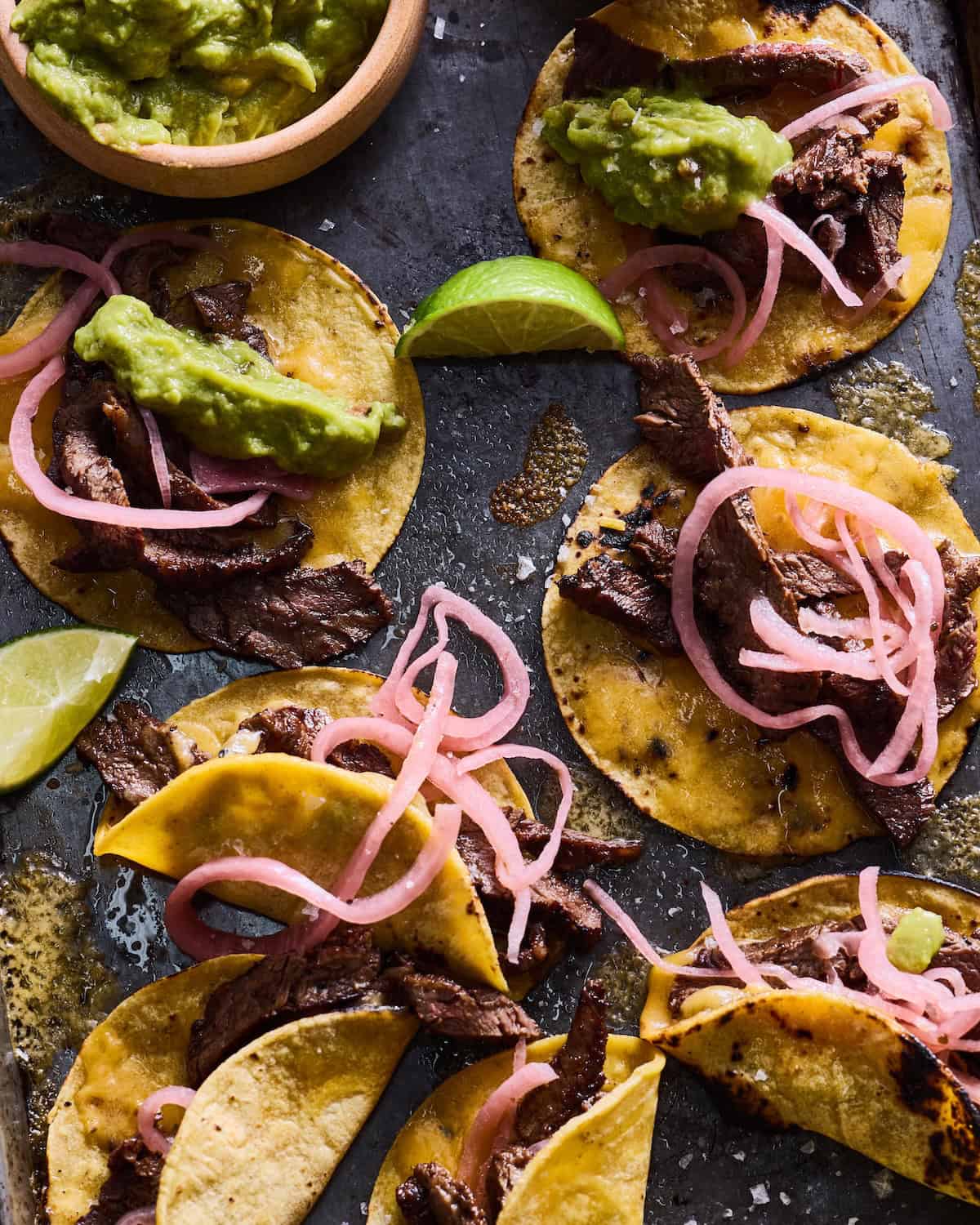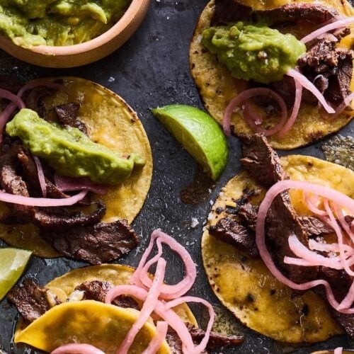 Divide the shredded cheese among the tortillas. Place the tortillas under the broiler until the cheese is melted. Remove from the oven, top each tortilla with steak, pickled red onions, and guacamole. Fold into tacos and serve the Skirt Steak Tacos immediately.