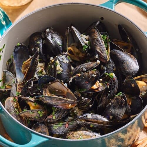 We are talking tender, briny Steamed Mussels in a garlicky, herb-packed white wine broth that is so good you will want to drink it straight from the bowl, served alongside the crispiest, most golden homemade frites. If you are in a full-on shellfish moment right now (same), you are going to want to bookmark my Steamed Clams with Garlic and Chives, my Seafood Pasta, and my Garlic Shrimp Scampi while you are here, because clearly seafood season is about to be in full effect and I am not sorry about it.