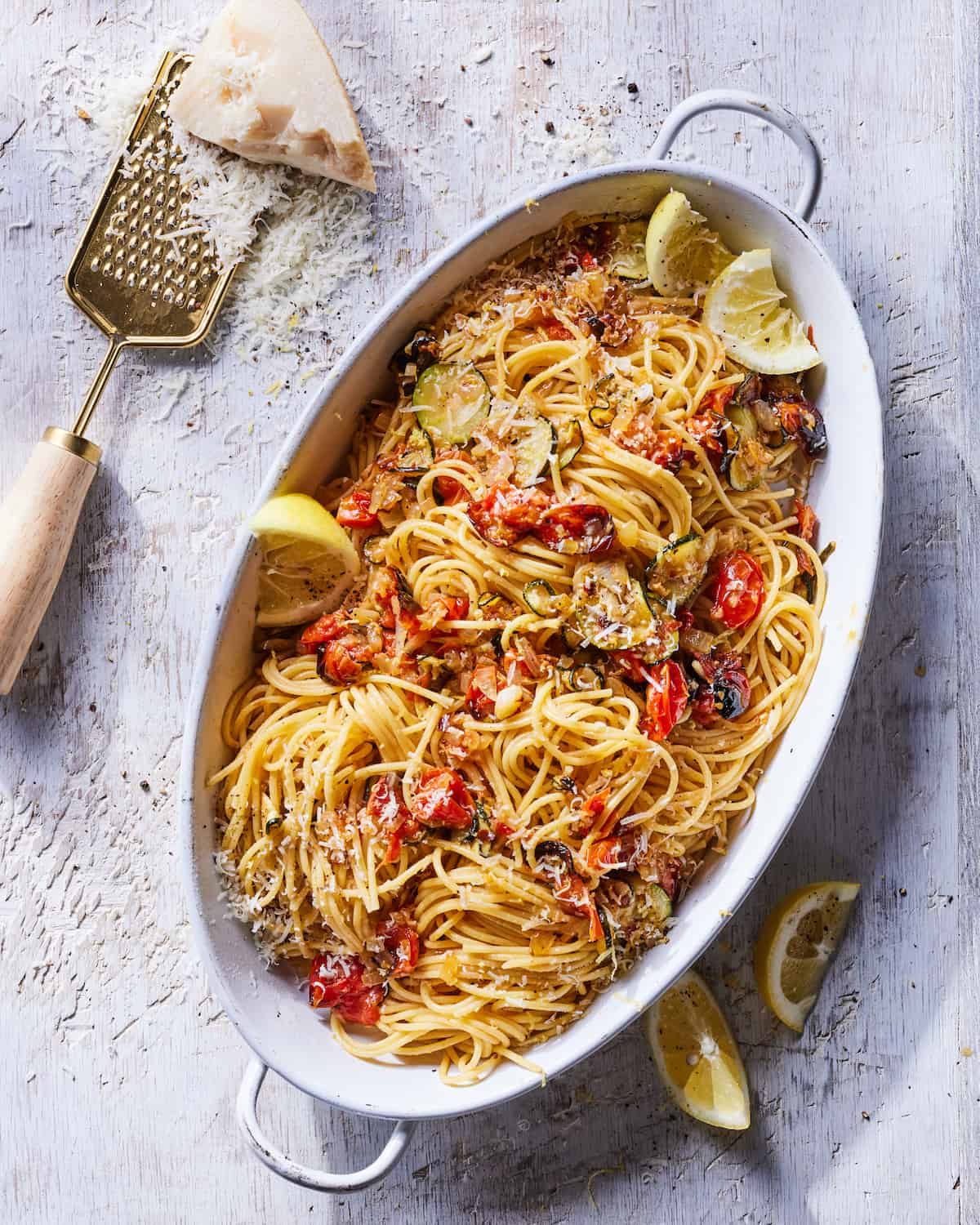 - Transfer all the roasted vegetables into a bowl with the cooked pasta. Toss to combine and add the lemon zest, juice and plenty of parmesan cheese. Serve immediately.