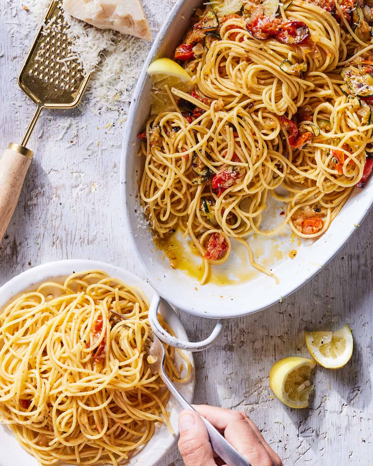 Ratatouille Pasta is a beautiful dish to serve alongside a big butter lettuce salad if you're entertaining. Or just whip it up for an easy weeknight meal. It's toddler approved as I serve this to Poppy on a frequent basis. If you're serving this to a small child, I tend to just give the spaghetti a quick slice so it's easier for her to grab and shove into her face ๐