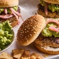 Step 4: Remove from the heat and serve on hamburger buns topped with a handful of shredded pepper jack and a hearty dollop of guacamole.