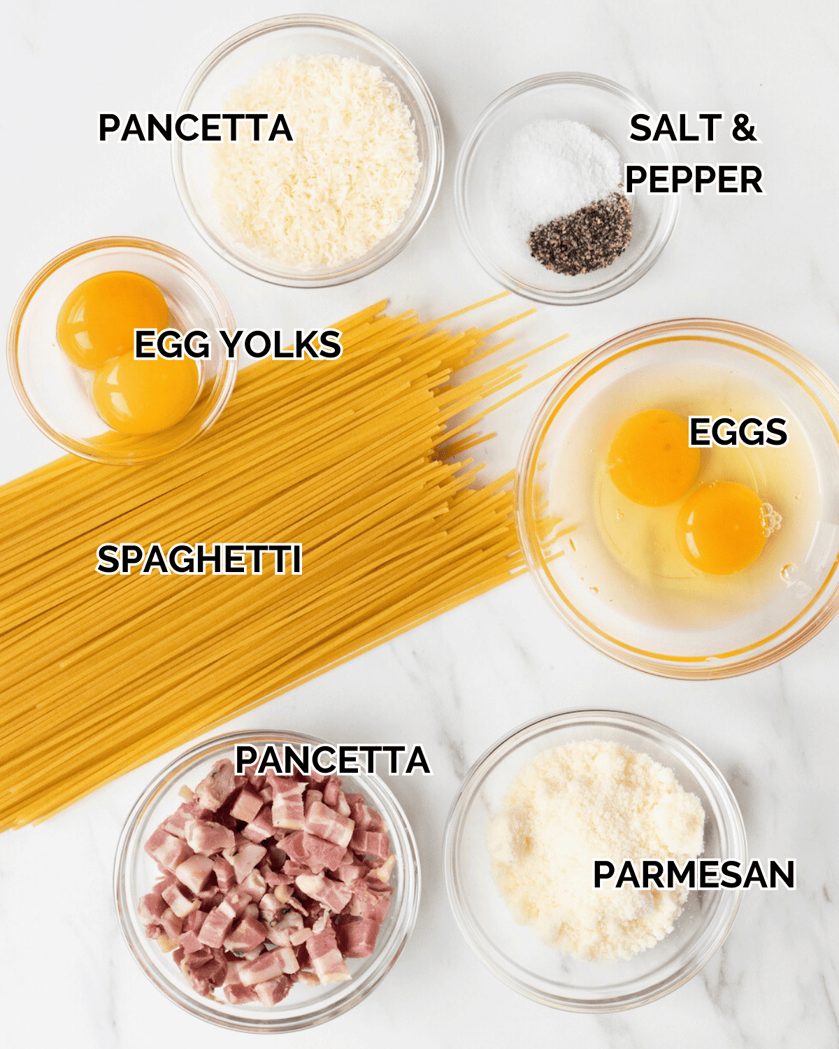 - Spaghetti โ Traditional carbonara is made with Spaghetti. Either fresh or boxed is totally fine!