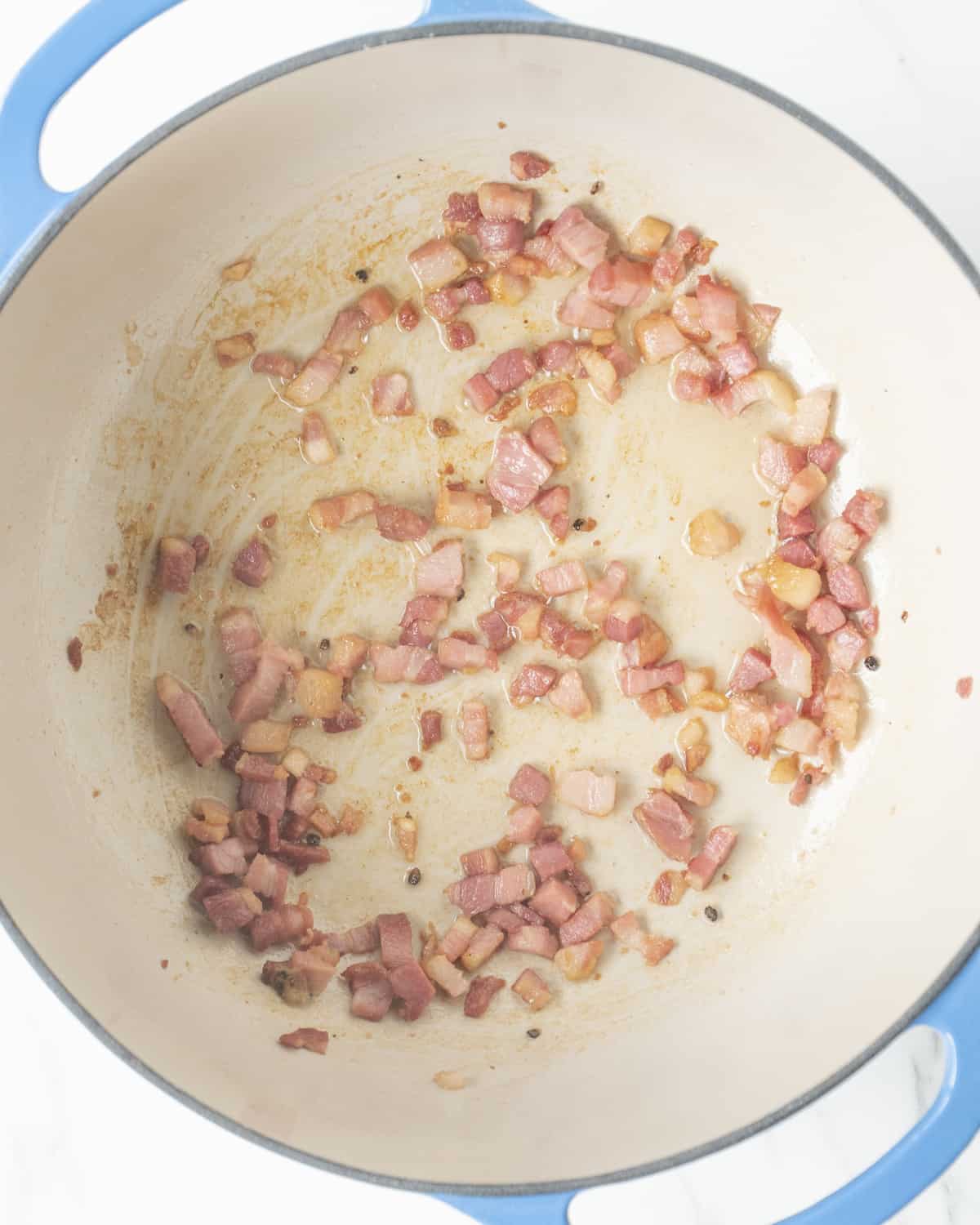 Step 2: Meanwhile, heat a large braiser or dutch oven over medium heat, add the pancetta, and sautรฉ until the fat just renders, and it's crispy.