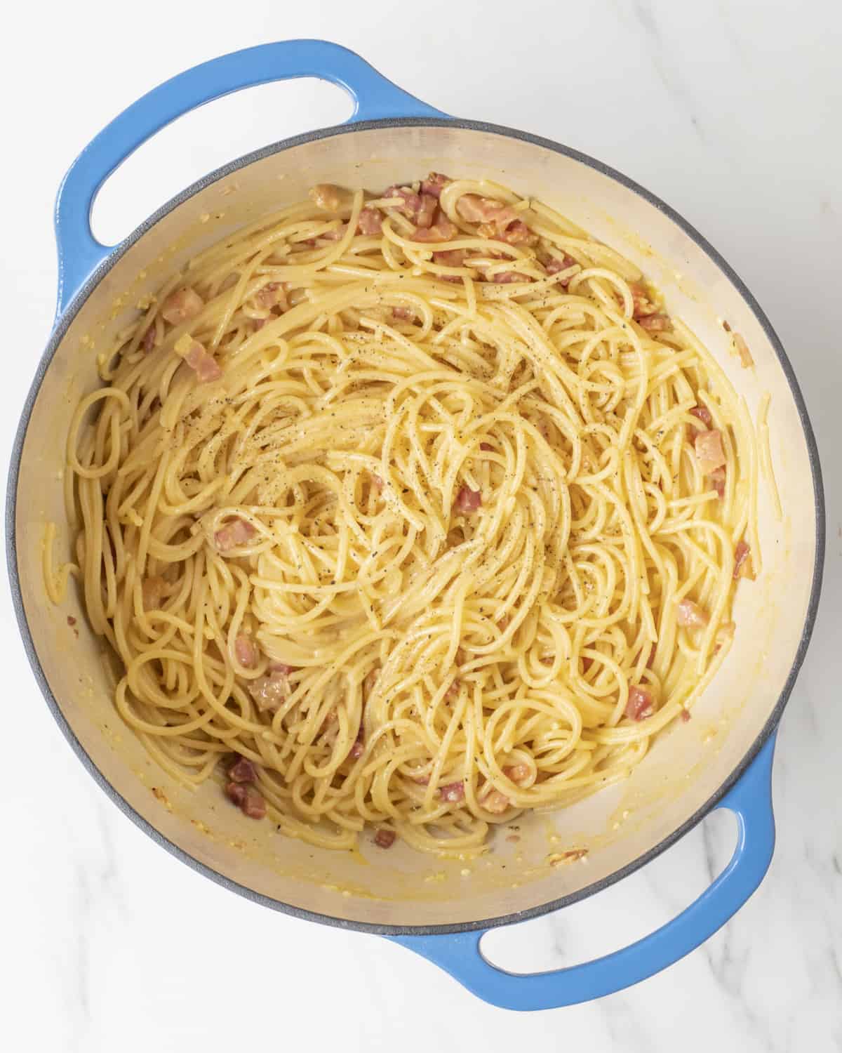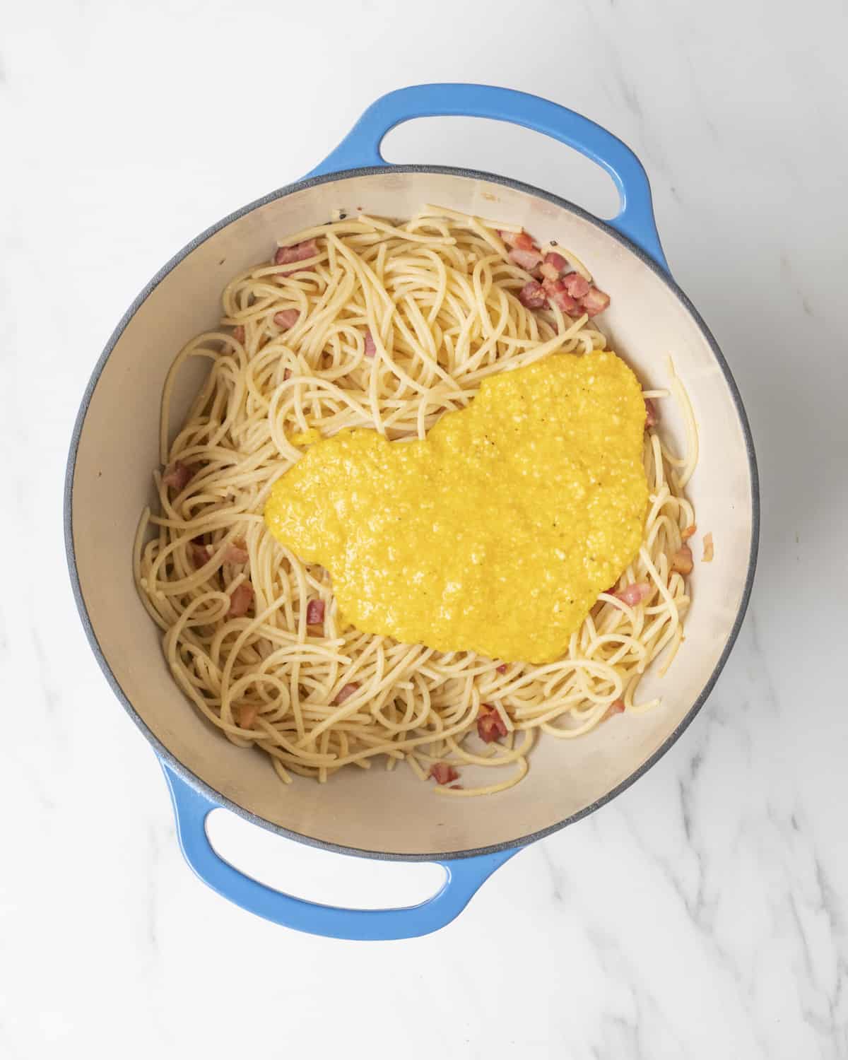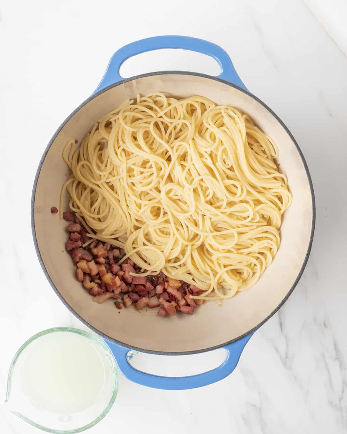 - Meanwhile, heat a large braiser or dutch oven over medium heat, add the pancetta, and sautรฉ until the fat just renders, and it's crispy. Remove from heat and stir in the pasta, followed by the egg slurry and let the residual heat from cooking the pancetta slowly warm the eggs. If you need to thin it out with some of the reserved pasta water, add a few tablespoons at a time until desired consistency.