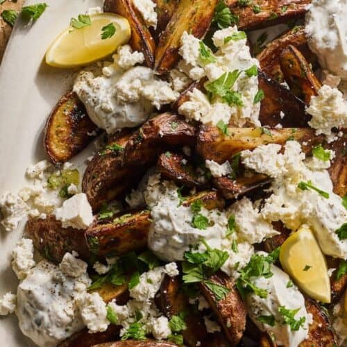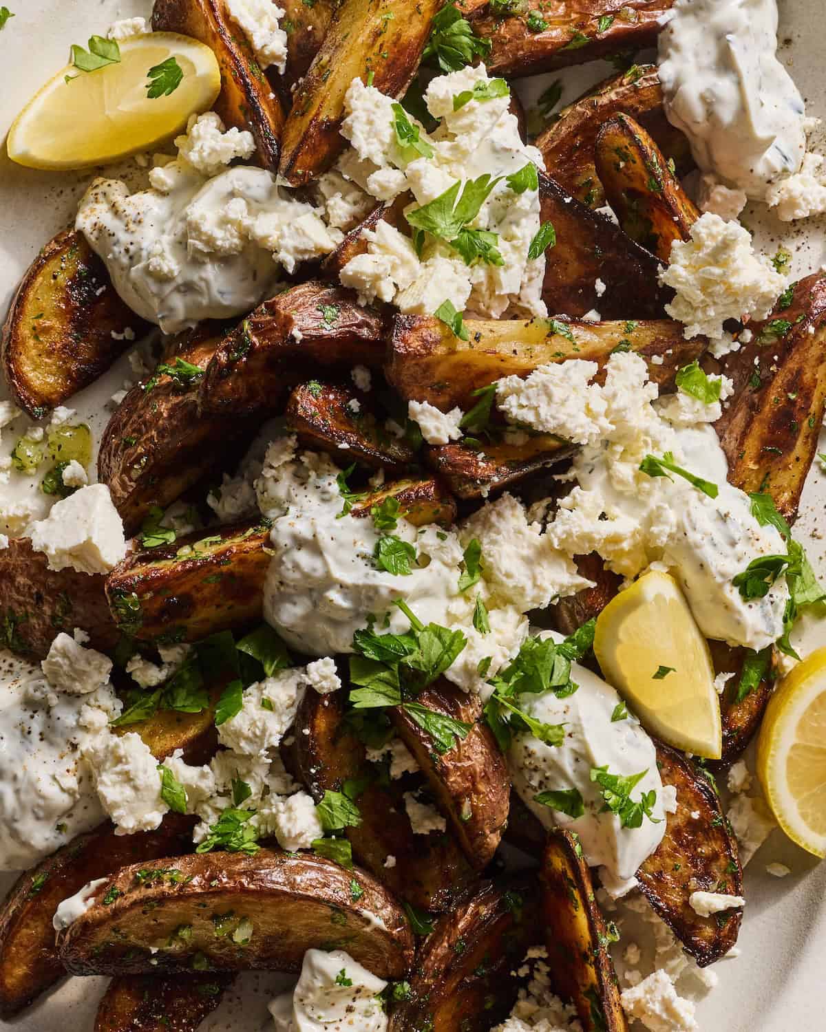 - Arrange the fries on a platter, sprinkle with crumbled feta, and add dollops of tzatziki over the top.