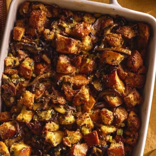 This is the best stuffing I've ever made and I'll never not use this recipe for the rest of my living days on this earth. I used homemade sourdough and chicken broth and both of these details didn't go unnoticed. What I appreciated most about this recipe was Gaby's prep ahead suggestions. I made everything the night before and popped it into the oven about an hour before serving dinner. Everyone raved about this stuffing this year - so flavorful and delicious!