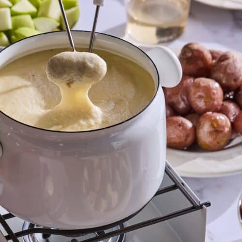 Serve immediately or keep warm gently. Fondue is best enjoyed right away, but if it needs to hang out, keep it over very low heat and give it an occasional stir.