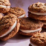 Place the cream cheese, butter, maple syrup, bourbon and vanilla bean paste in the bowl of a stand mixer fitted with the paddle and mix until well combined. Add the powdered sugar and continue to mix, scraping down the sides, as needed. Add more or less powdered sugar to achieve desired consistency. Sandwich two cookies together with frosting for a total of 15 cookie sandwiches